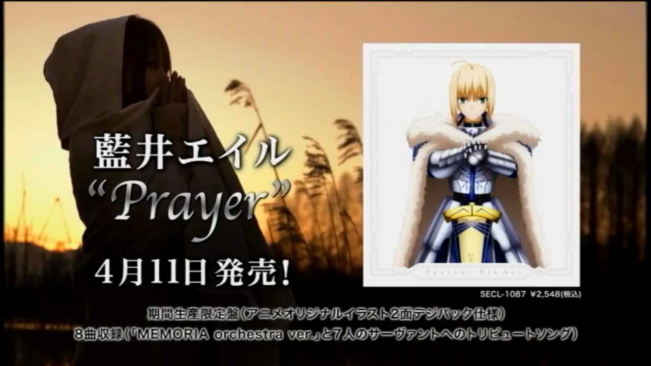 藍井エイル”Prayer” 2012年4月11日発売CM 期間生産限定盤(アニメオリジナルイラスト2面デジパック仕様) 8曲収録(「MEMORIA orchestra ver.」と7人のサーヴァントへのトリビュートソング)[http://www.aoieir.com/] 11日2012年4月7人のCMMEMORIAorchestraPrayerverエイルサーヴァント発売藍井藍井エイル