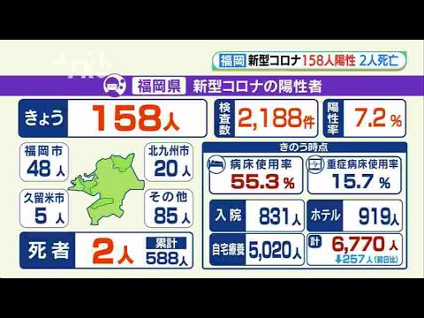 Share Facebook Twitter Pinterest LinkedIn 福岡県は13日、新型コロナウイルスの検査で新たに158人の陽性を発表しました。 県内では、男女1人ずつのあわせて2人が亡くなっています。 続きはこちらから https://rkb.jp/news/004036.html RKBRKBニュース新型ウイルス検査で陽性
