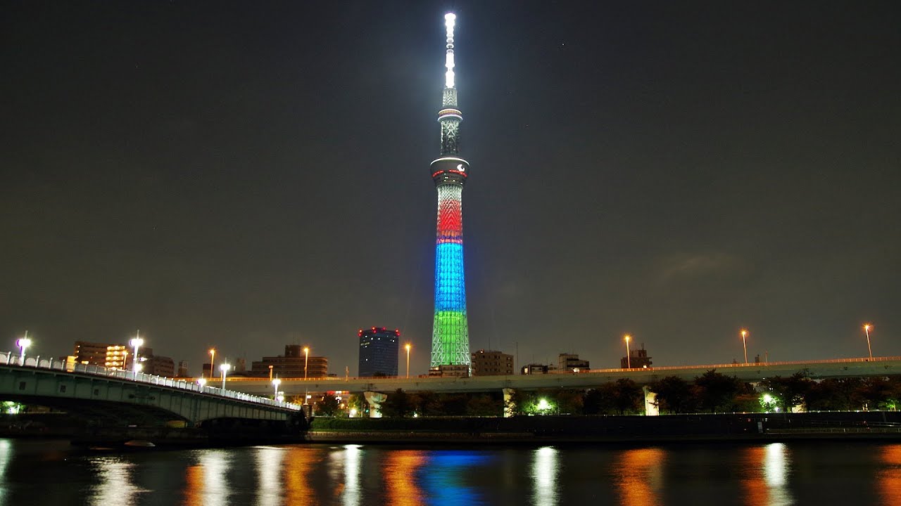 隅田川 逆さツリー 水鏡 墨田区役所 アサヒビール 東京スカイツリー ライトアップ 東京 2020 オリンピック 五輪ライティング 浅草 2021 7.24 シンボル Five Rings レーザー