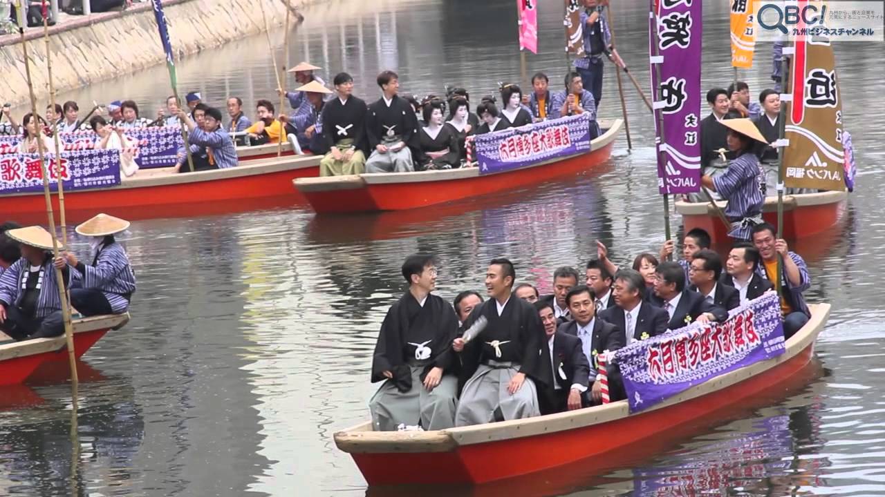 『六月博多座大歌舞伎』の出演者らがキャナルシティ博多横の水流公演から数隻の船に乗り込み、川端ぜんざい広場で口上を述べられた後、博多リバレインに向かいます。