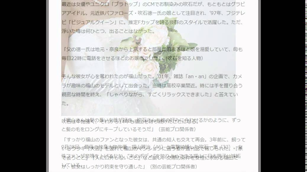 Share Facebook Twitter Pinterest LinkedIn 福山雅治と結婚した吹石一恵が交際中に守り通した「条件」 吹石一恵が福山雅治との交際中に守った「条件」を女性自身が報じている 福山は「家で会うこと」「人に口外しないこと」などの条件を求めると関係者 「彼女はしっかり約束を守り通した」とも話している 引用 livedoor’NEWS http://news.livedoor.com/topics/detail/10677414/ YouTube エディタ吹石一恵