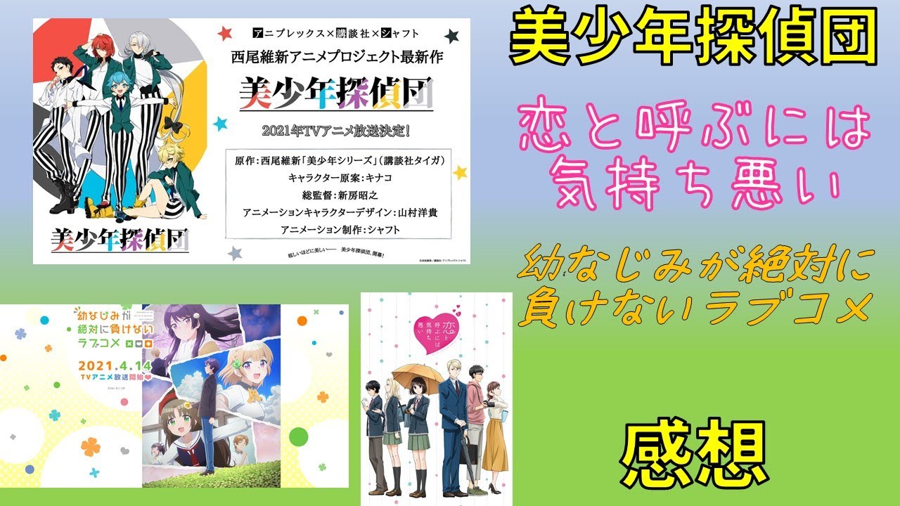 Share Facebook Twitter Pinterest LinkedIn 2021年春アニメ 美少年探偵団 恋と呼ぶには気持ち悪い 幼なじみが絶対に負けないラブコメ 三作品の第一話の感想です。 【チャプター】 0:00 美少年探偵団 3:04 恋と呼ぶには気持ち悪い 6:52 幼なじみが絶対に負けないラブコメ TVアニメ 美少年探偵団