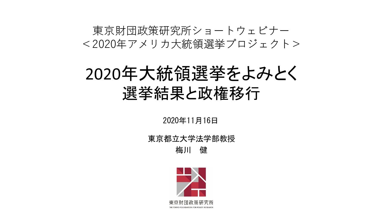 本ショートウェビナーでは、「2020年アメリカ大統領選挙と日米経済関係プロジェクト」プロジェクトメンバーである梅川健氏(東京都立大学法学部教授)が、11月16日時点の投票結果を解説するとともに、トランプ陣営による訴訟や再集計の現状、連邦議会選挙結果が与えるバイデン新政権運営への影響についても触れながら、今後の政権移行のゆくえについて読み解いていく。