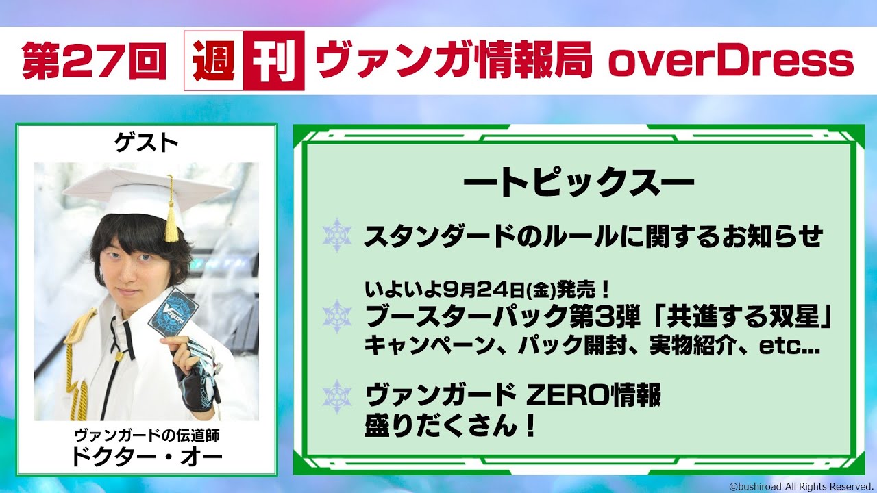 毎週火曜21時より、週刊ヴァンガ情報局 overDressをお送りします! ■出演■ MC:#真野拓実 ゲスト:#ドクター・オー ■番組内容 「週刊ヴァンガ情報局 overDress」とは? アニメに関するお話や、最新カード情報、イベント情報など、「カードファイト!! ヴァンガード」のあらゆる最新情報をお届けする番組! ひと足早く、ヴァンガードの最新情報をゲットしよう! ヴァンガードファイター必見の番組です!#ヴァンガード #VGD #生配信 #TCG overdressTCGVanguardVGVGDアニメヴァンガヴァンガードオーバードレスカードゲームカードファイト!! ヴァンガード overDressブシロードホビー