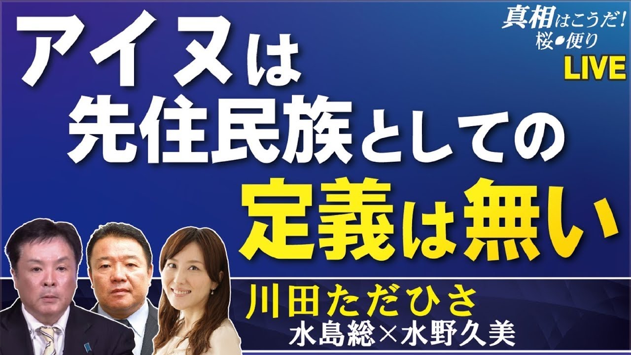Share Facebook Twitter Pinterest LinkedIn 日本再生に取り組む草莽たちによる様々な活動報告のほか、時事や喫緊の問題をめぐる分析や識者の見解など、見失ってはならない「真相」をお届けします! キャスター:水島総・水野久美 ■ アイヌは先住民族としての定義は無い スカイプ:川田ただひさ(札幌市議会議員) ◆チャンネル桜北海道公式HP http://ch-hokkaido.jp/ アイヌモシㇼ