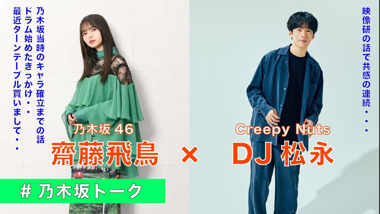 乃木坂46・齋藤飛鳥さんとCreepyNuts・DJ松永さんのトーク。 お互いのグループ初期の苦悩など、音楽についての話で共感の連続のトークは必聴です!聞いていて、良い関係性なのが伝わってきます! #齋藤飛鳥#DJ松永#乃木坂46 Creepy NutsDJ松永乃木坂46齋藤飛鳥