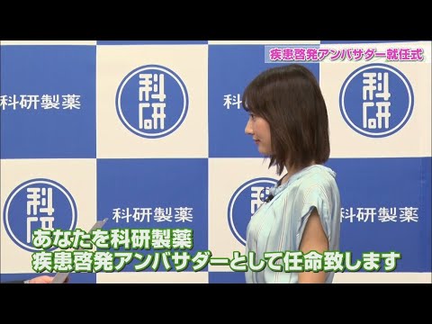 科研製薬株式会社 代表取締役社長 堀内裕之からモデル・女優として活躍されている武田玲奈さんへ「科研製薬 疾患啓発アドバイザー」任命書を授与する就任式の様子です。