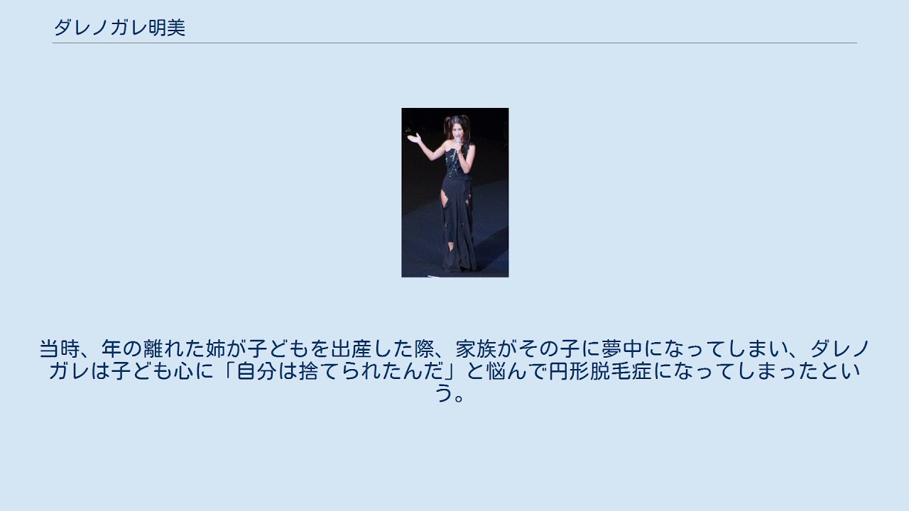 当時、年の離れた姉が子どもを出産した際、家族がその子に夢中になってしまい、ダレノガレは子ども心に「自分は捨てられたんだ」と悩んで円形脱毛症になってしまったという。