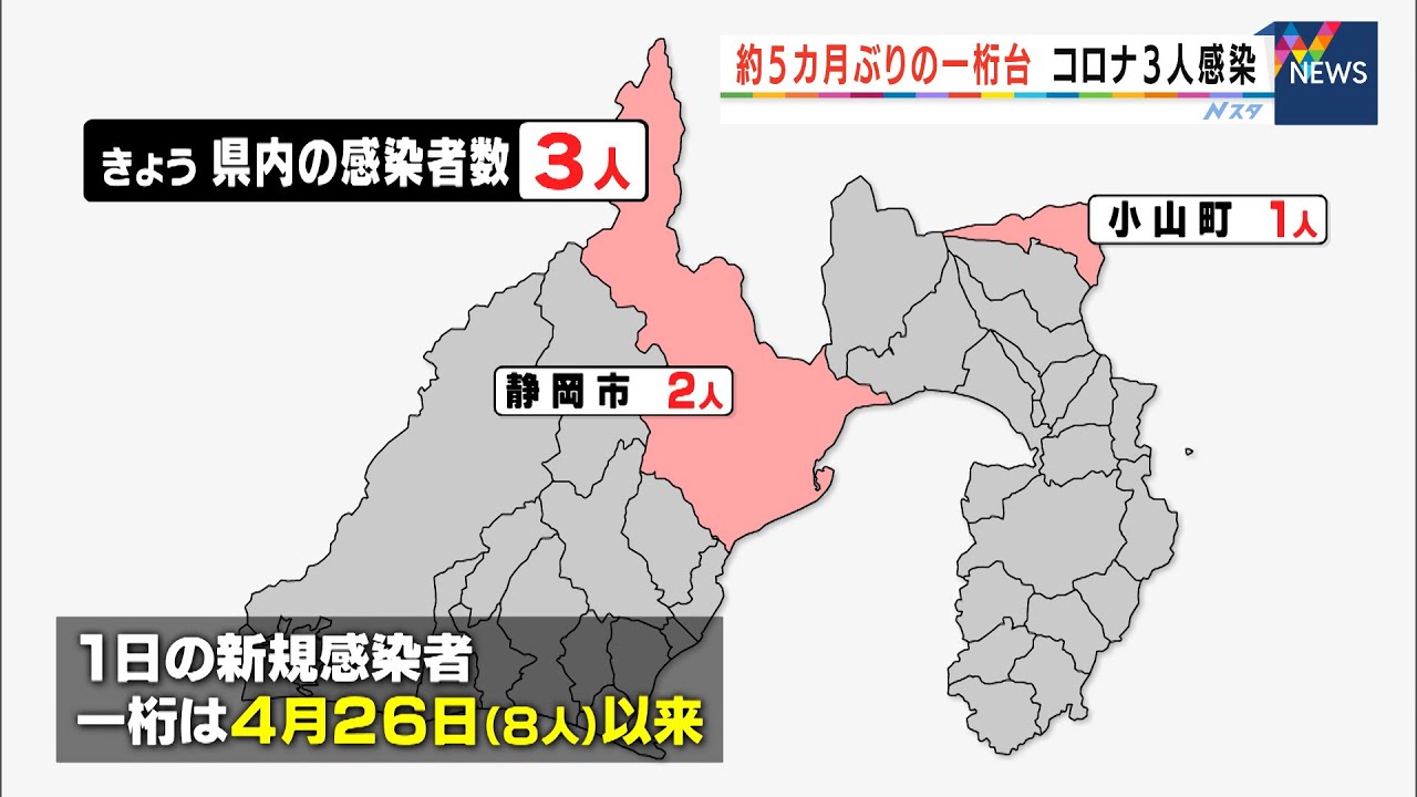 感染者の数を自治体別にみてみますと、静岡市で2人、小山町で1人となっています。県内の1日の新規感染者数が一桁になるのは、4月26日以来(8人)約5カ月ぶりです。県内の病床使用率は、県全体で7.5%、重症者病床も5.0%となっています。