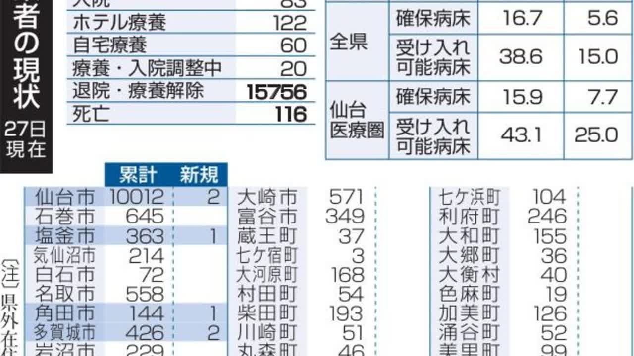 宮城県内で10月1日、新たに8人の新型コロナウイルス感染が確認されました。前の週の金曜と比べると17人少なくなっています。 感染が確認されたのは、仙台市で4人、多賀城市で3人、名取市で1人の合わせて8人です。 年代別では10歳未満2人、10代1人、30代3人、40代1人、50代1人となっています。 1日午後3時時点で、県内の医療機関に入院している人は49人、このうち重症者は3人です。 ホテルで療養