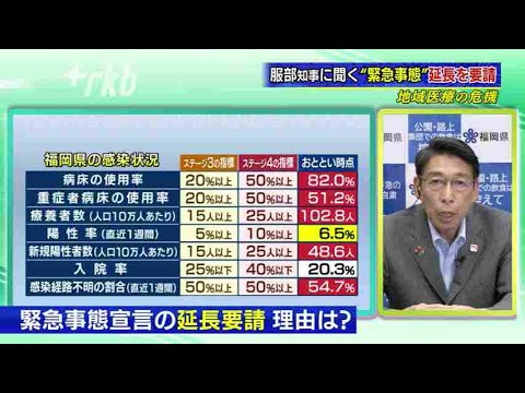 Share Facebook Twitter Pinterest LinkedIn 新型コロナウイルスの感染状況と今後の政策について、福岡県の服部誠太郎知事に話を聞きます。 25日午後の臨時会見で、緊急事態宣言の延長を国に要請したことを明らかにしましたが、なぜ解除は難しいと判断したのでしょうか? 続きはこちらから https://rkb.jp/news/002515.html RKBRKBニュース医療非常事態宣言