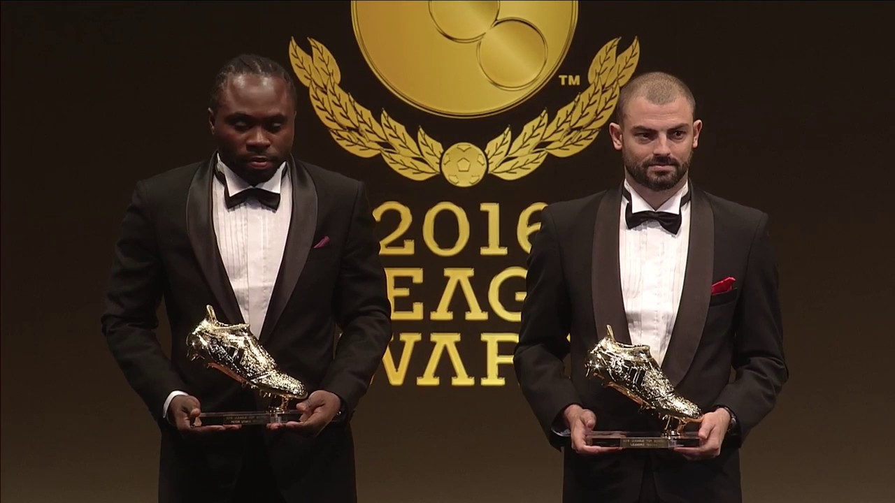 12月20日に横浜アリーナで年間表彰式「2016Jリーグアウォーズ」が開催。Jリーグ名誉女子マネージャーの足立 梨花さんがJ1得点王の2人を祝福しました。