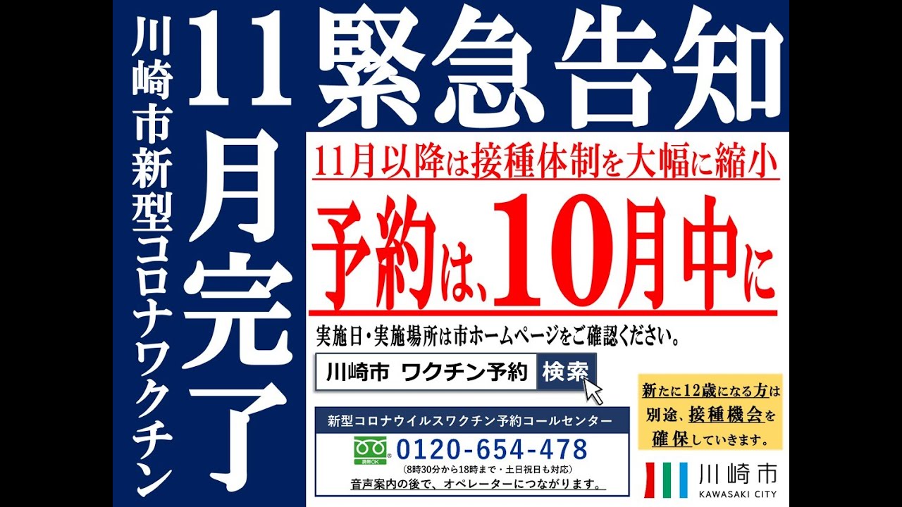 川崎市では、新型コロナワクチン接種を希望される方の1回目接種を10月中に終えるよう、接種体制を整備しています。