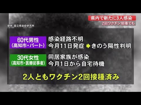 感染が判明したのは高知市の30代女性と60代男性、須崎市の80代男性の3人で、いずれも軽症です。このうち高知市の60代のパートの男性は感染経路が不明で、今月11日に発症し、きのう陽性が判明しました。同僚3人を接触者として検査する予定です。また高知市の医療従事者の30代女性は同居家族が感染し、今月1日から自宅待機していたため勤務先に接触者はいません。高知市の2人はいずれも2回目のワクチン接種から4ヵ月以上経過していました。