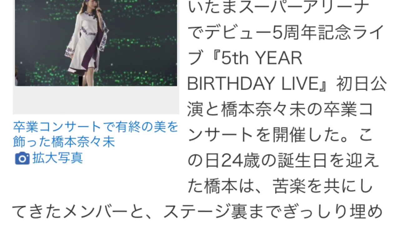 人気アイドルグループ・乃木坂46が20日、さいたまスーパーアリーナでデビュー5周年記念ライブ『5th YEAR BIRTHDAY LIVE』初日公演と橋本奈々未の卒業コンサートを開催した。この日24歳の誕生日を迎えた橋本は、苦楽を共にしてきたメンバーと、ステージ裏までぎっしり埋め尽くした3万5000人の観客に見送られ、5年半のアイドル活動に終止符を打った。