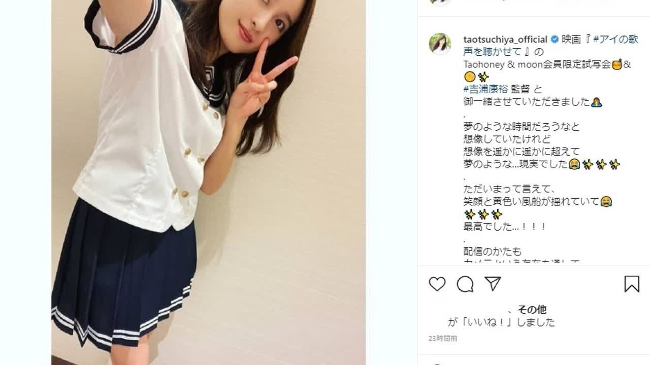 ミニスカセーラー姿を披露した土屋太鳳 女優の土屋太鳳(26)が10月13日、セーラー服を着た自撮り写真をInstagramに投稿した。こちらは主人公役の声優を務めたアニメ映画『アイの歌声を聴かせて』(10月29日公開)の特別試写会で披露した衣装らしい。土屋自身は〈リアル高校生だった頃から自撮りは上手くないのですが急いだとはいえ相変わらず下手です〉と謙遜しているが、ファンからは〈最高の自撮り〉〈まだ
