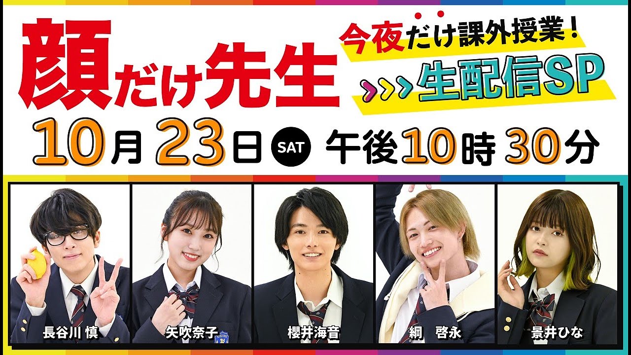 土ドラ「顔だけ先生」の第3話放送直前の生配信企画! 「菊玲学園」の教室を舞台に生徒役の出演者が大集合し ドラマの見どころはもちろん、撮影の裏話や出演者の意外な素顔も披露!? ■出演 長谷川 慎 矢吹奈子 櫻井海音 綱 啓永 景井ひな ■進行 高橋知幸(東海テレビアナウンサー) #顔だけ先生 #土ドラ #ふるさとエール2021 2021イッチー祭りドラマライブ啓永土ドラ学園学園ドラマ学校景井ひな東海テレビ東海テレビ祭り櫻井海音特別編特番生配信矢吹奈子綱長谷川 慎