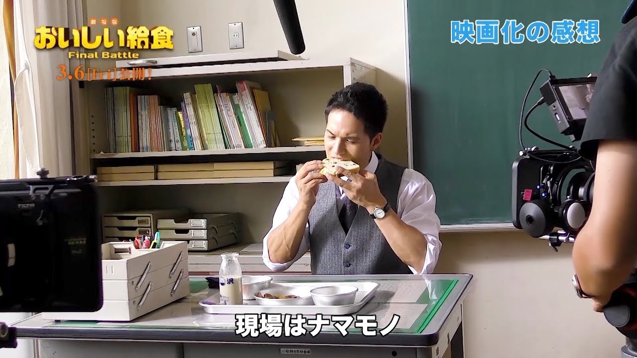 この度、公開を6日に控え、出演者への独占インタビュー、メイキングなど特別映像を解禁。激熱バトルを繰り広げた市原演じる甘利田先生と、佐藤演じるライバル神野ゴウの紹介に始まり、現場で給食がどのように準備され、バトルシーンがどのように撮影されたかなど、大爆笑のメイキング映像を見ることができる。