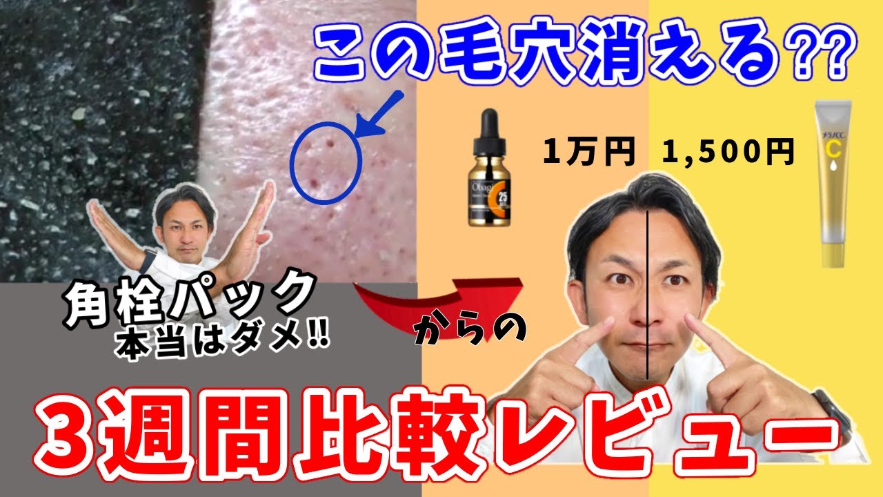やってはいけないとされる「角栓除去シート」を使って、大きな毛穴を作り、それが綺麗に消えるのかの検証をしました。鼻を半分に分けて片方にメラノCC美容液、反対側にオバジC25美容液をつけて、つける美容液によっても差が出るのかの検証しました。