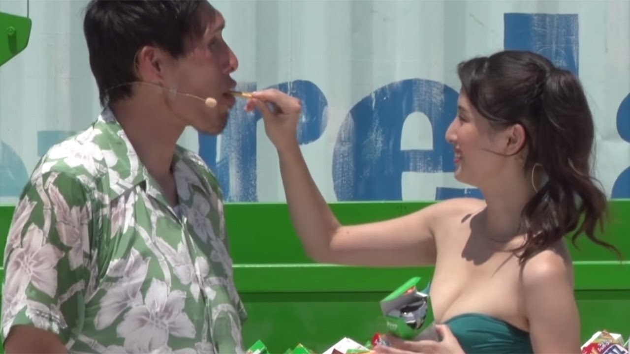 「ハッピーキャッチャー」は縦横、高さともに約4メートルで、大量のプリッツが敷き詰められ、純金製プリッツやアウトドアグッズなどのプレゼント券が入ったプリッツも用意された。橋本さんと篠原さんは自らがクレーンとなってつかみ取りに挑戦。自転車のプレゼント券を手に入れた橋本さんは「ハッピー、つかみました!」と大喜びで、篠原さんは“ハッピーのおすそ分け”として橋本さんに「プリッツの“あ~ん”」をリクエストしながらも大照れだった。