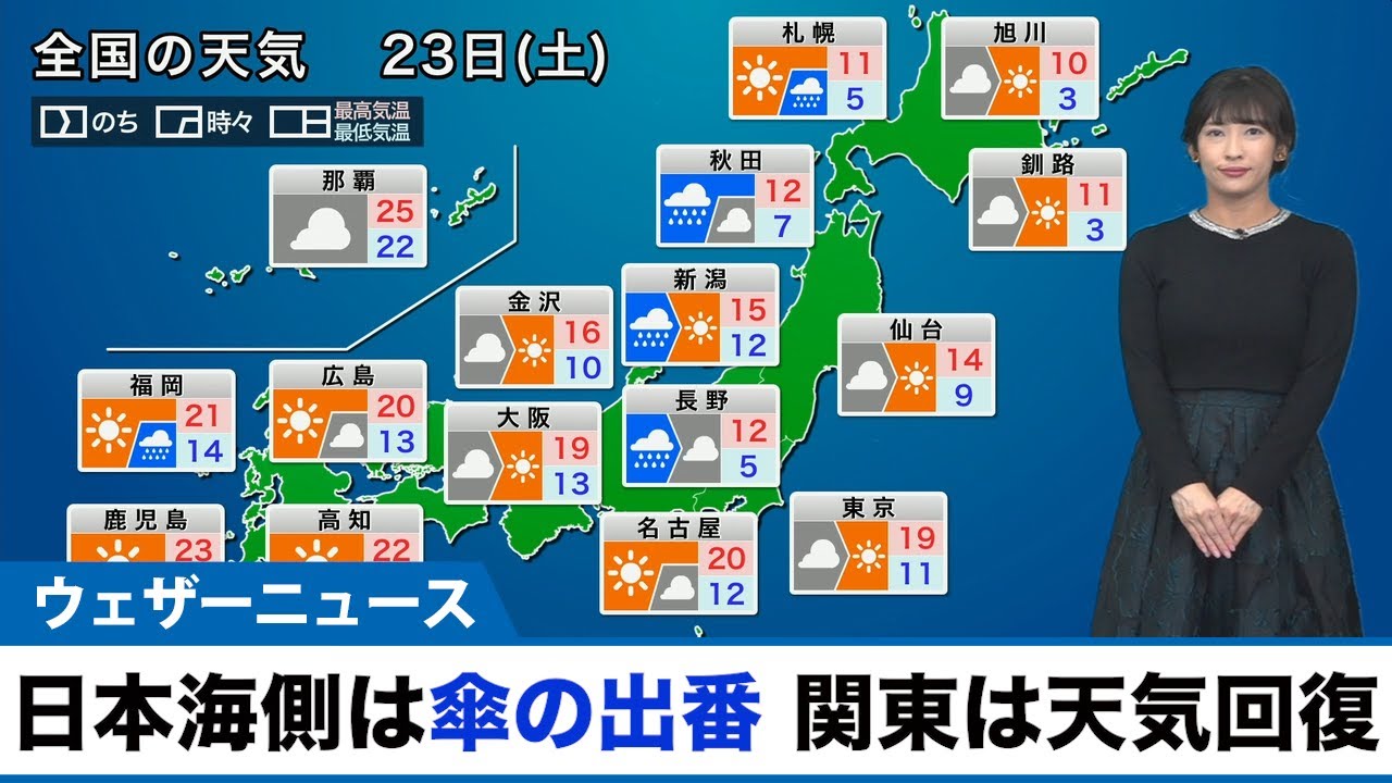 西高東低の気圧配置となって日本海側は雨の降る時間帯がありますが、関東では天気が回復して寒さが緩みます。