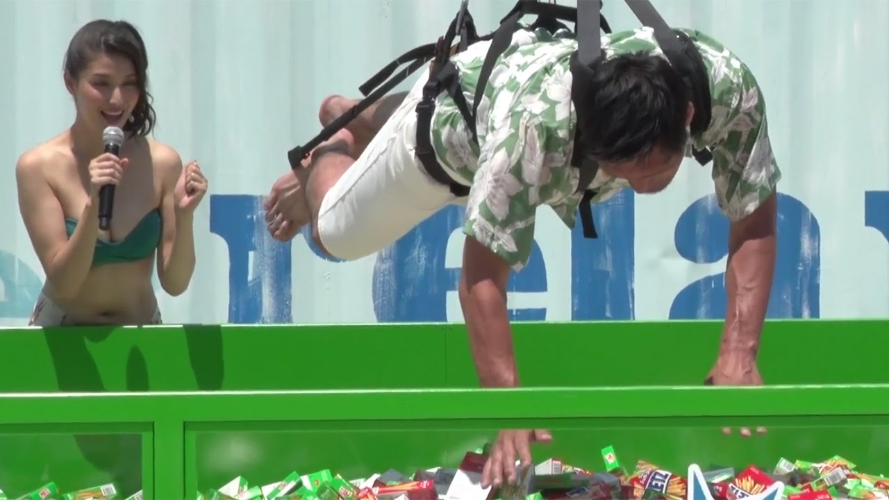 タレントの橋本マナミさんが7月21日、東京都内で行われた江崎グリコのスナック菓子「プリッツ」のPRイベントに柔道家の篠原信一さんとともに出席。会場には巨大クレーンマシーン「ハッピーキャッチャー」が設置され、ビキニ姿で登場した橋本さんや篠原さんが自らがクレーンとなってつかみ取りに挑戦した。