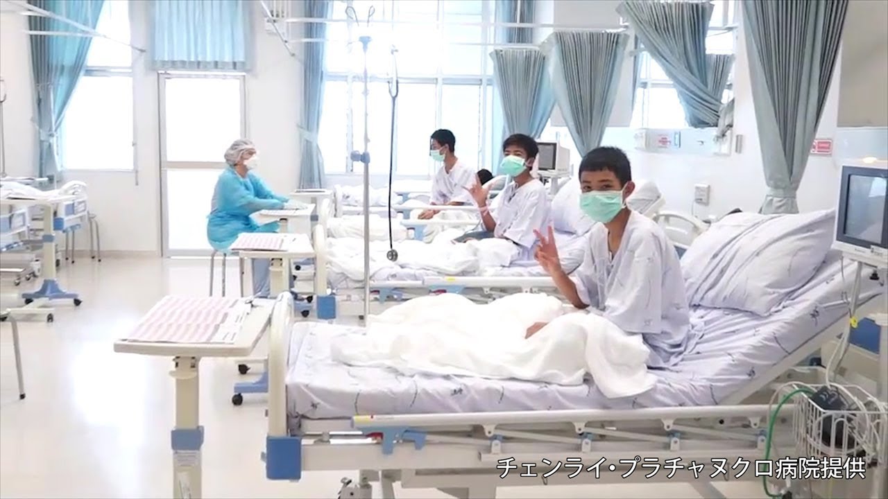 タイ北部、チェンライ郊外の洞窟から無事救出された少年ら13人が病院で元気な姿を見せた
