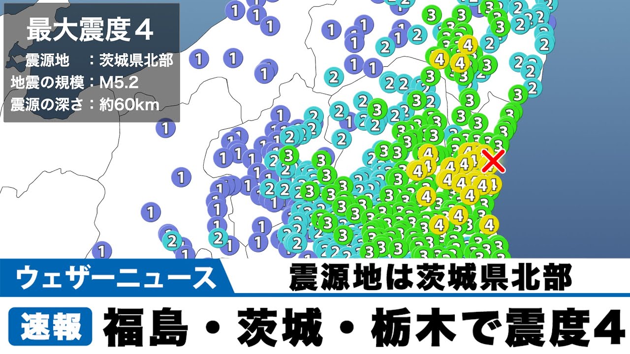 11月1日(月)6時14分頃、福島県・茨城県・栃木県で最大震度4を観測する地震がありました。