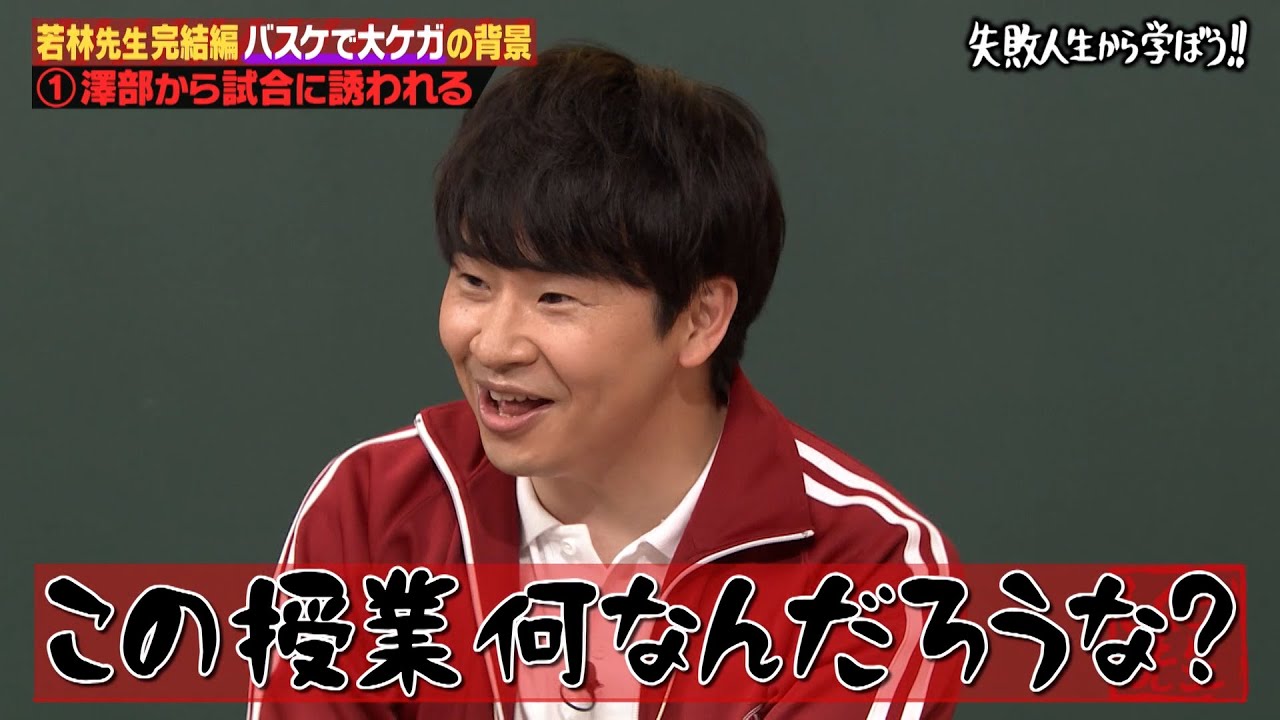 担任若林の授業、後半戦!前回は遊びのバスケで靭帯を損傷し、全治2カ月のケガをしてしまった経緯を教えてくれた若林先生。今回は、おだてに乗ってしまってムチャをして大ケガした悪夢の試合の全貌が明らかに!さらに、大人のケガがどんな試練を招くのか実体験をもとに教えてくれます。歳をとっても体力があると思い込んでいる人たちへ、過信が招く危険と回避するための教訓を学びます。