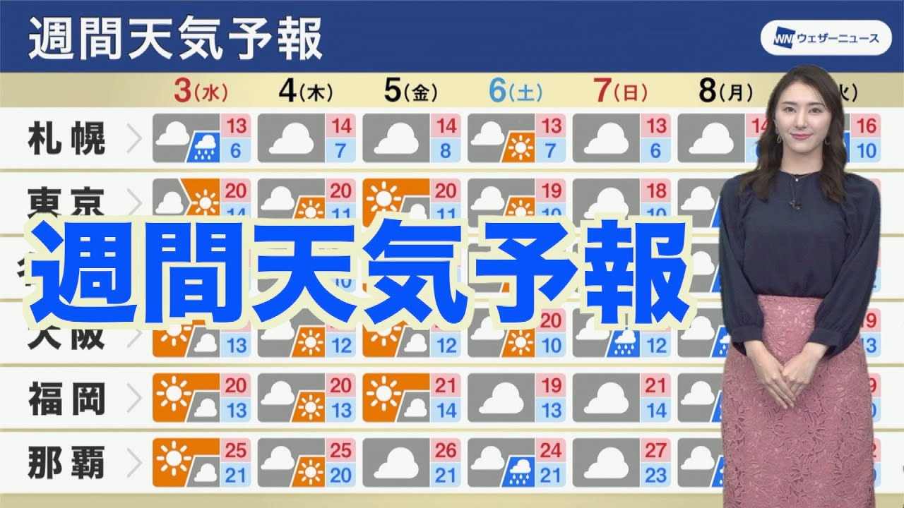 今週前半は北日本などで雨の降る日がある予想です。週後半は高気圧に覆われて晴れる日が多いものの、次の週末は西から天気が下り坂に向かう予想です。