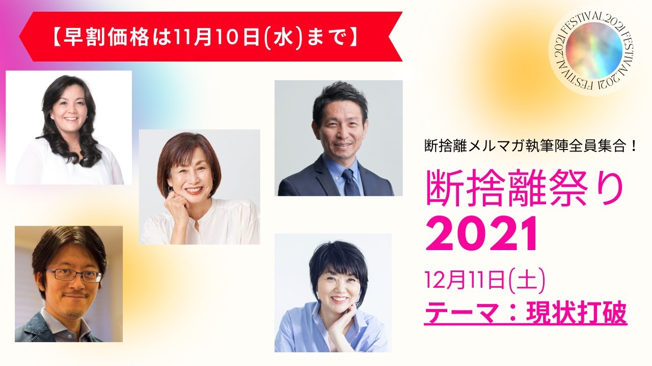 断捨離祭りとは、毎日配信している断捨離メルマガ執筆陣たちの講演を一挙に楽しめるスペシャルイベントです!