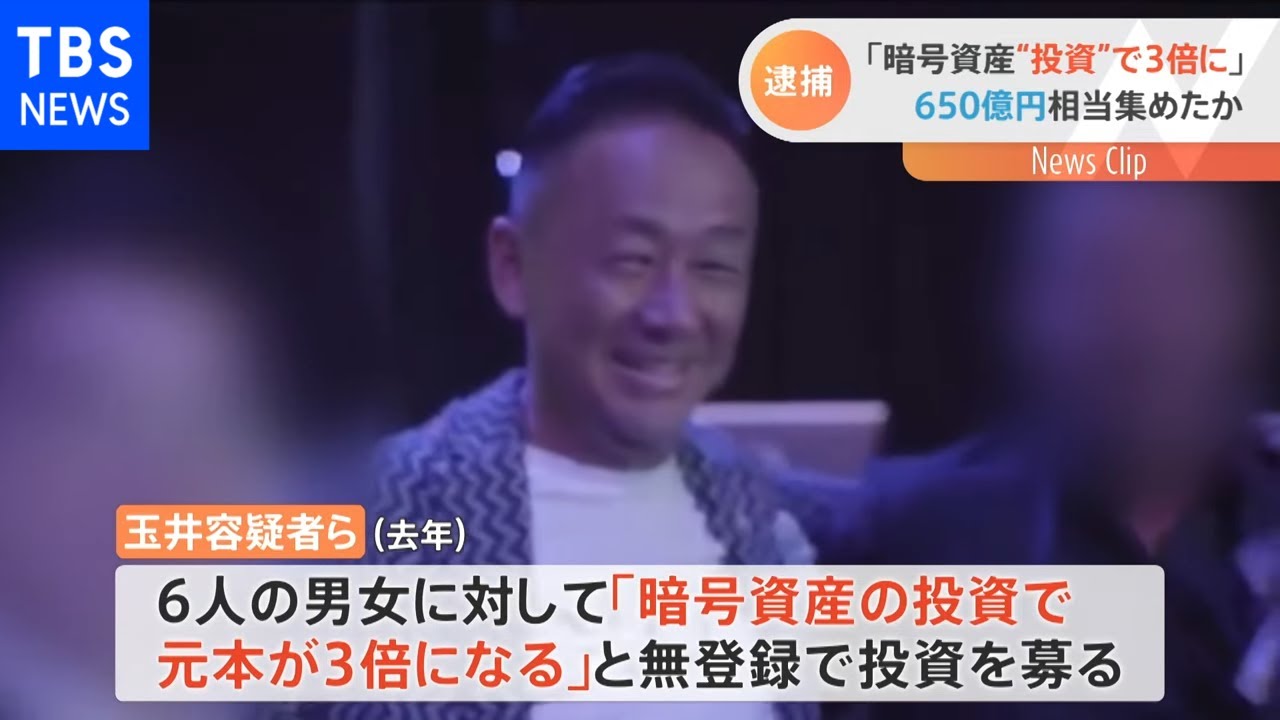 逮捕されたのは、会社役員の玉井暁容疑者(53)ら7人です。玉井容疑者らは去年、6人の男女に「暗号資産の投資で元本が3倍になる」などと無登録で投資を募り、1700万円相当のビットコインを集めた疑いがもたれています。玉井容疑者らは海外の「ジュビリーエース」という会社がおこなっているAIを使った暗号資産の売買投資で、「毎月9000万円稼いでいる」などと宣伝していました。
