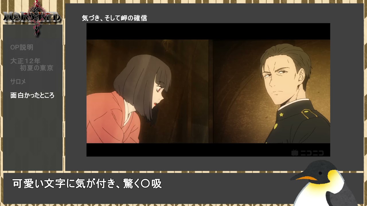 幽明境を異にする というのがこのMars Red第一話「陽のあたる場所」に対する感想でした。 あまりにも面白かったのですが実際、初見では気が付けないところも多く、 最初みなさんのコメントに理解ができなかった部分もあり 繰り返し見ていて更に面白さが増したので、気が付いたことをまとめました。1話どころかすでに3話が投稿されていますが、、、 (変なところもありますがご容赦を・・・) #MARS_REDMARS REDマズレ大正時代