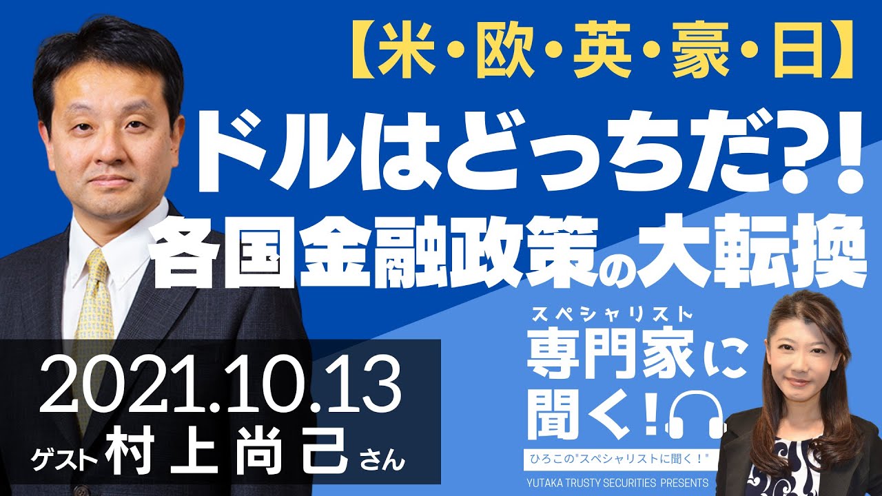 ひろこのスペシャリストに聞く!今回のゲストはエコノミスト 村上尚己さんをお招きし、「【米・欧・英・豪・日】ドル円はどっちだ?!各国金融政策の大転換」と題して、動き始めたドル円相場に焦点を当て、各国の中央銀行が行っている金融政策の内容を確認し、各国は今後どのような姿勢で金融マーケットを牽引していくのか、為替市場はどのように推移していくのかについて詳しく解説いたします。