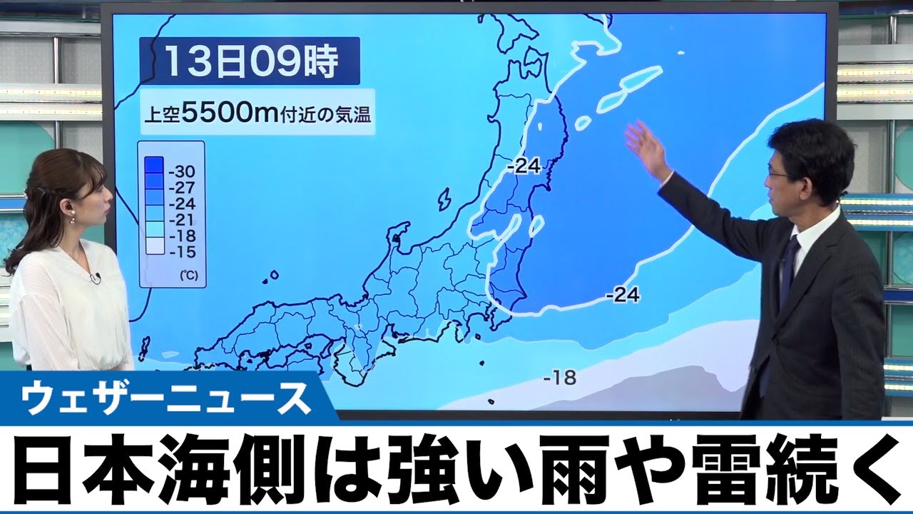 日本海側では上空の寒気の影響が残ります。雨が降り、雷を伴って強く降るおそれがあります。外出の際は雨具が必須です。