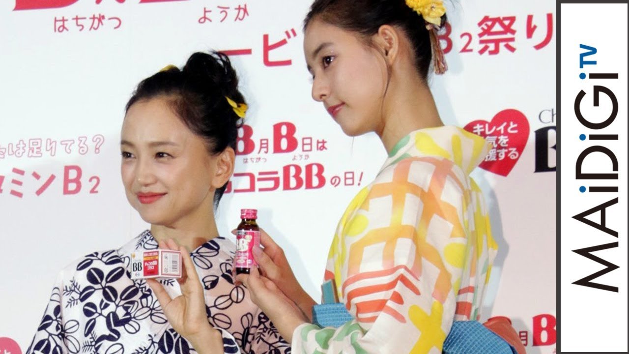 女優の新木優子さんと永作博美さんが8月8日、東京都内で行われたエーザイ「チョコラBB」の「ビタミンB2啓発・夏祭りPRイベント」に出席した。2人は今年初という浴衣姿で登場。