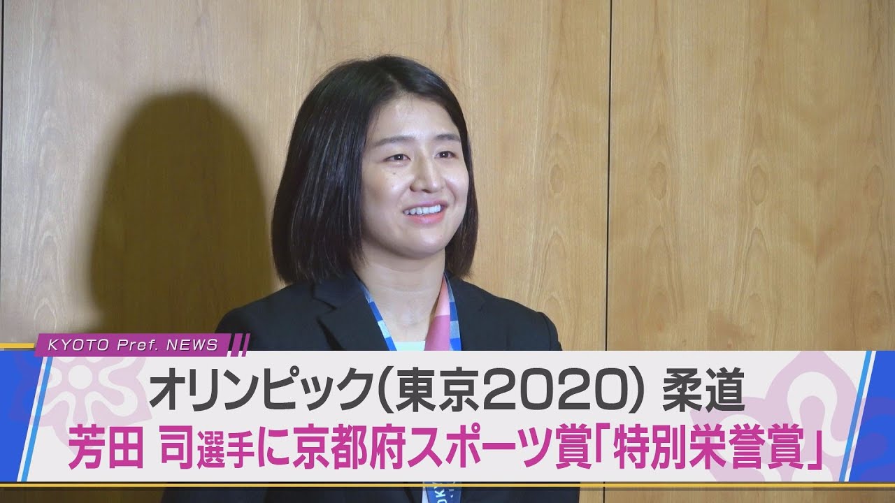 東京オリンピック柔道女子57キロ級で、初出場ながら見事銅メダルを獲得した京都市上京区出身の芳田司選手に8日、京都市スポーツ賞が贈られました。スーツ姿で京都府庁を訪れたのは柔道女子57キロ級で銅メダル、新種目の柔道混合団体で銀メダルを獲得した芳田司選手です。上京区出身の芳田選手は小学校時代、水泳や陸上をするなど運動神経抜群で2年生から近くの道場に通い柔道の基礎を身につけました。オリンピック初出場の芳田選手は、準決勝で惜しくも敗れましたが、3位決定戦で得意の内股で技ありを2度奪い、「合わせ技一本」で勝利、見事銅メダルを獲得しました。芳田選手にはオリンピックでの功績をたたえて京都市スポーツ最高栄誉賞の表彰状と記念のプレートが贈られました。