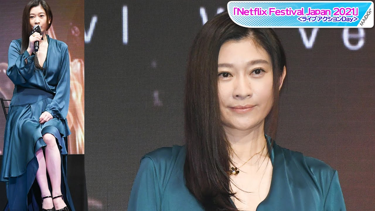 女優の篠原涼子さんがこのほど、東京都内で開催された「Netflix Festival Japan 2021」に出席した。2022年に配信予定のNetflixのオリジナルシリーズ「金魚妻」に主演する篠原さんは、シックなグリーン系のドレス姿で登場。胸元がざっくりと開いたカシュクール風のデザインで美肌をのぞかせ、フィッシュテールの裾から美脚もすらり。ロングヘアをワンサイドに寄せて、大人の魅力を漂わせていた。
