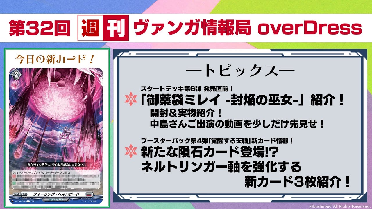 毎週火曜21時より、週刊ヴァンガ情報局 overDressをお送りします! ■出演■ MC:#真野拓実 アシスタント:#進藤あまね■番組内容 「週刊ヴァンガ情報局 overDress」とは? アニメに関するお話や、最新カード情報、イベント情報など、「カードファイト!! ヴァンガード」のあらゆる最新情報をお届けする番組! ひと足早く、ヴァンガードの最新情報をゲットしよう! ヴァンガードファイター必見の番組です! #ヴァンガード #VGD #生配信 #TCG overdressTCGVanguardVGVGDアニメヴァンガヴァンガードオーバードレスカードゲームカードファイト!! ヴァンガード overDressブシロードホビー