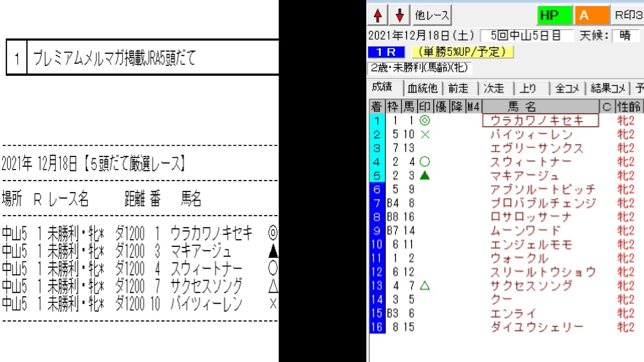 競馬予想メールマガジン配信結果 2021年12月18日 5頭BOX 1戦1勝