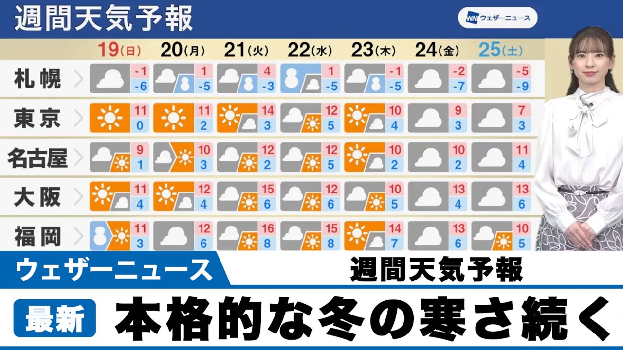 北日本や東日本を中心に本格的な冬の寒さが続き、東京などでも最低気温が0℃前後まで下がる日がありそうです。