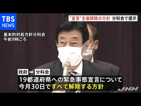 政府が分科会で専門家に示しているのは、東京や大阪など19の都道府県に出されている緊急事態宣言について、期限の今月30日ですべて解除する方針です。このほか、8つの県に出されているまん延防止等重点措置についても全て解除するとしていて、「宣言」や「まん延防止措置」が全国どこにも出されていない状況になるのは、およそ半年ぶりです。