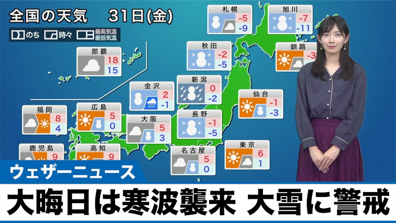 年越し寒波が襲来して日本海側の広い範囲で大雪や吹雪に警戒が必要です。太平洋側も一部で雪が降り、内陸部では積もる可能性があります。