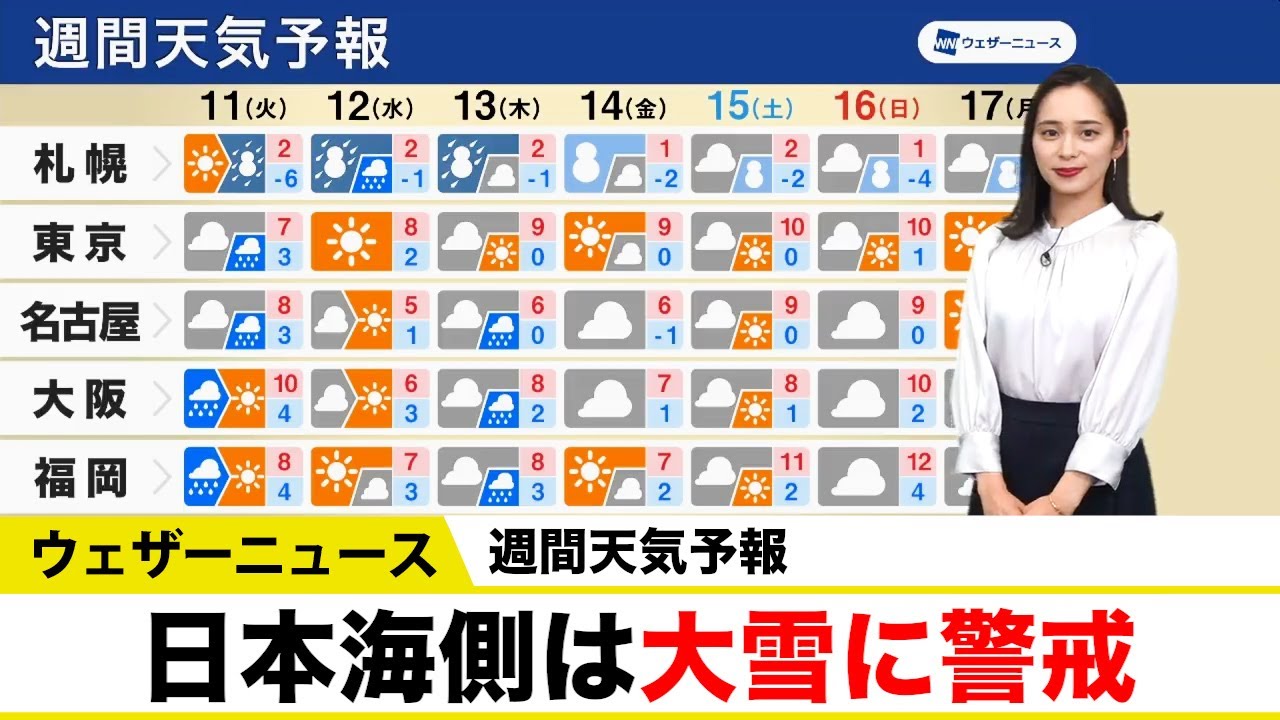 荒天のピークは12日(水)頃で過ぎる見込みですが、その後も週後半にかけて冬型の気圧配置が続く予想です。