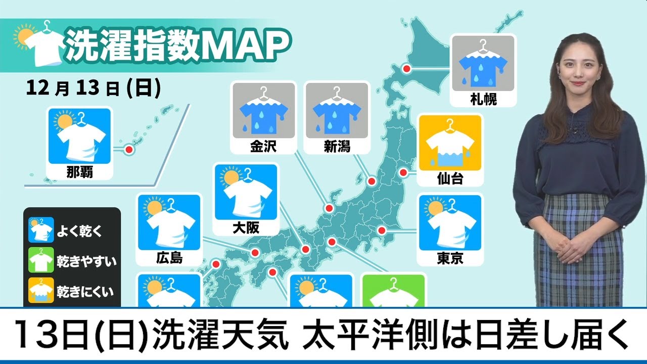 12月13日(日)は強い寒気が流れ込む影響で北海道では雪が強まります。また東北の日本海側や北陸でも雨や雪となるため、洗濯物は乾きにくい予想です。 一方、西日本や東日本太平洋側は冬晴れとなり、洗濯物もよく乾きそうです。 2020Casterウェザーニュースキャスターゲリラ豪雨ゲリラ雷雨ニュース予報北日本台風台風情報地震大雨天気天気予報情報東日本気象気象予報士減災西日本防災
