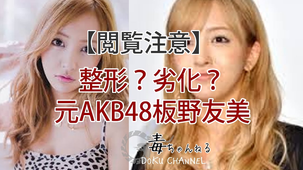 Share Facebook Twitter Pinterest LinkedIn 元AKB48板野友美(22歳)の画像がまたもや劣化したとかこれは酷いとネット上で話題となっている。板野と言えば度重なる整形疑惑などにより、ネット上でしばしば物議を醸していることで有名。そんな板野の最新の画像をここ数年の変化と共にご覧頂きたい。 AKB48劣化整形板野友美画像