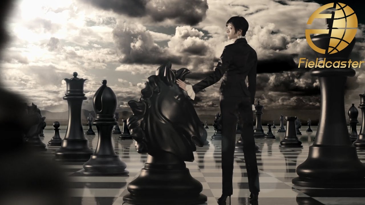 強大なチェス盤の上、白と黒の世界の中に佇む真木さん。