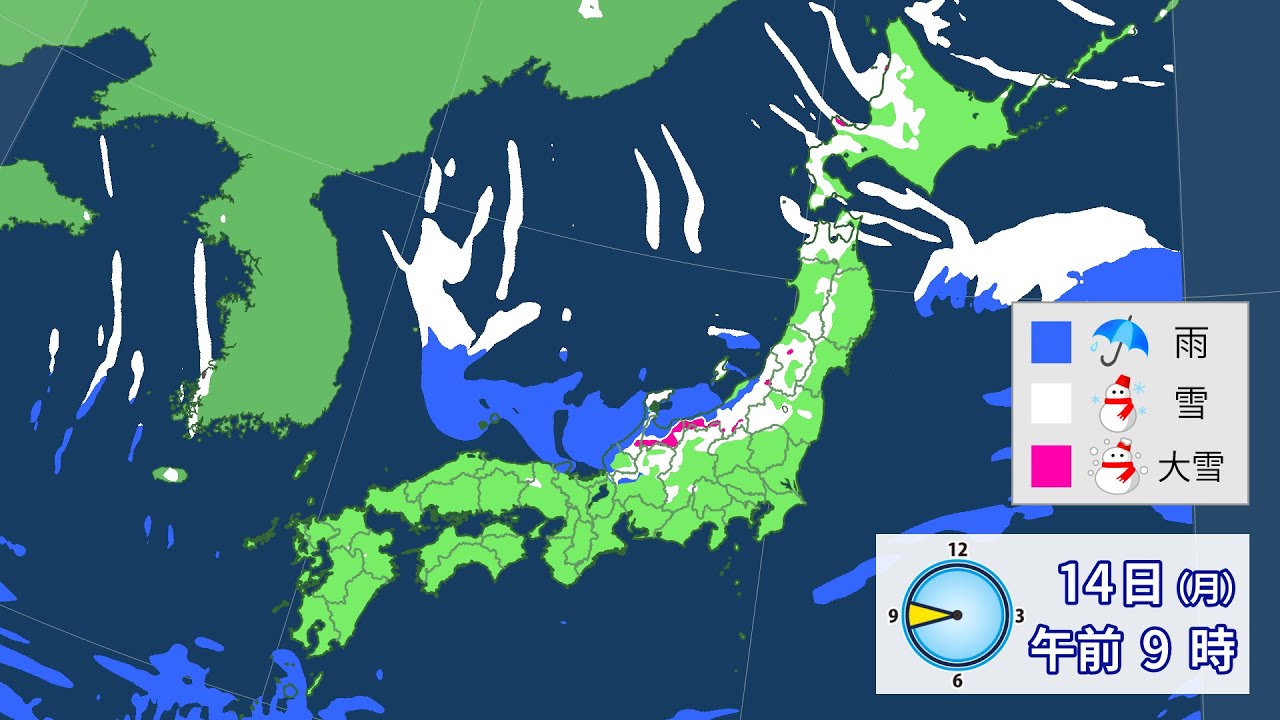 14日は冬型の気圧配置が強まり、大陸から寒気が流れ込みます。日本海側では山陰や北陸などはじめは雨の所もしだいに雪に変わり、大雪となるでしょう。山沿いだけでなく平地でも雪の積もる所があり、交通機関に影響が出る可能性もあります。
