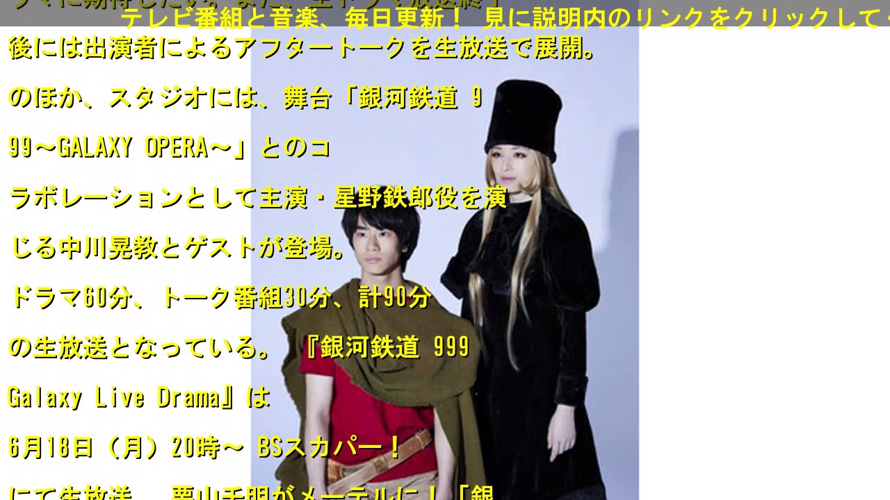 テレビ番組と音楽、毎日更新! http://entertainmentshowjp.com/ あの国民的人気を誇る伝説的SF作品「銀河鉄道999」を、栗山千明、前田旺志郎をはじめとする豪華キャストによって、初の実写化。「銀河鉄道999 Galaxy Live Drama」として、BSスカパー!で“生放送”することが決定した。■あらすじ西暦2xxx 年の未来世界。裕福な人々は機械の身体に魂を移し替えて機械化人となり、永遠の生を謳歌している。一方、貧しい人々は機械の身体を手に入れることができずに死の恐怖に怯え、さらに多くの生身の人間は機械化人に差別・迫害されていた。宇宙は、「機械化こそは最良の生き方であり、宇宙の意志である」として「全宇宙機械化」を目指す機械帝国の女王プロメシュームによって支配されており、生身の人間からすると機械化人は恐怖の対象ではあるが、恐怖やみじめさから逃れるために機械の身体に憧れを持つ者も少なくない…。母を機械伯爵に殺された少年・星野鉄郎は謎の美女・メーテルから銀
