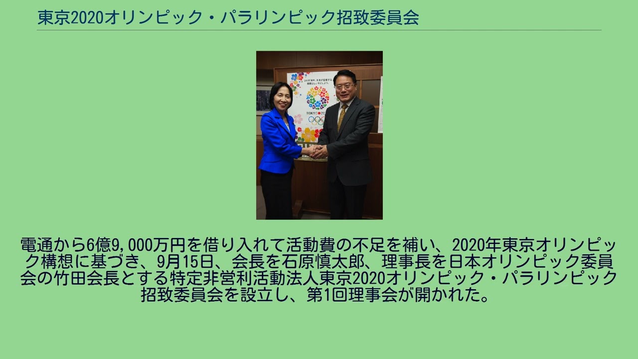 電通から6億9,000万円を借り入れて活動費の不足を補い、2020年東京オリンピック構想に基づき、9月15日、会長を石原慎太郎、理事長を日本オリンピック委員会の竹田会長とする特定非営利活動法人東京2020オリンピック・パラリンピック招致委員会を設立し、第1回理事会が開かれた。